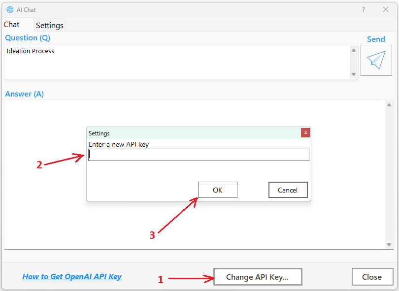 b) In the chat window click “Change API Key”, enter API key and press “OK” (see below).