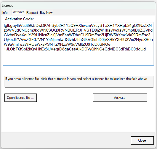 c) Once you have received the unlock code, open the license window, click the Activate tab, and paste the unlock code. Click the Activate button.