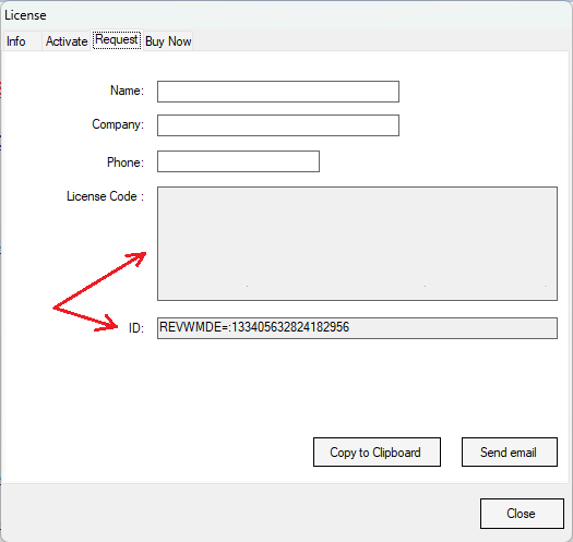 b) Press Request tab and send us your “ID” and “License Code” (copy the string ID and, if available, the License Code or press Send email button).