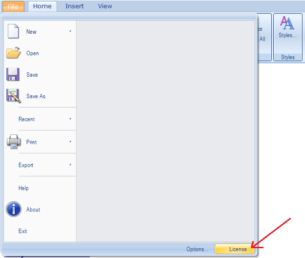a) Open the license window by clicking on the “License” button.